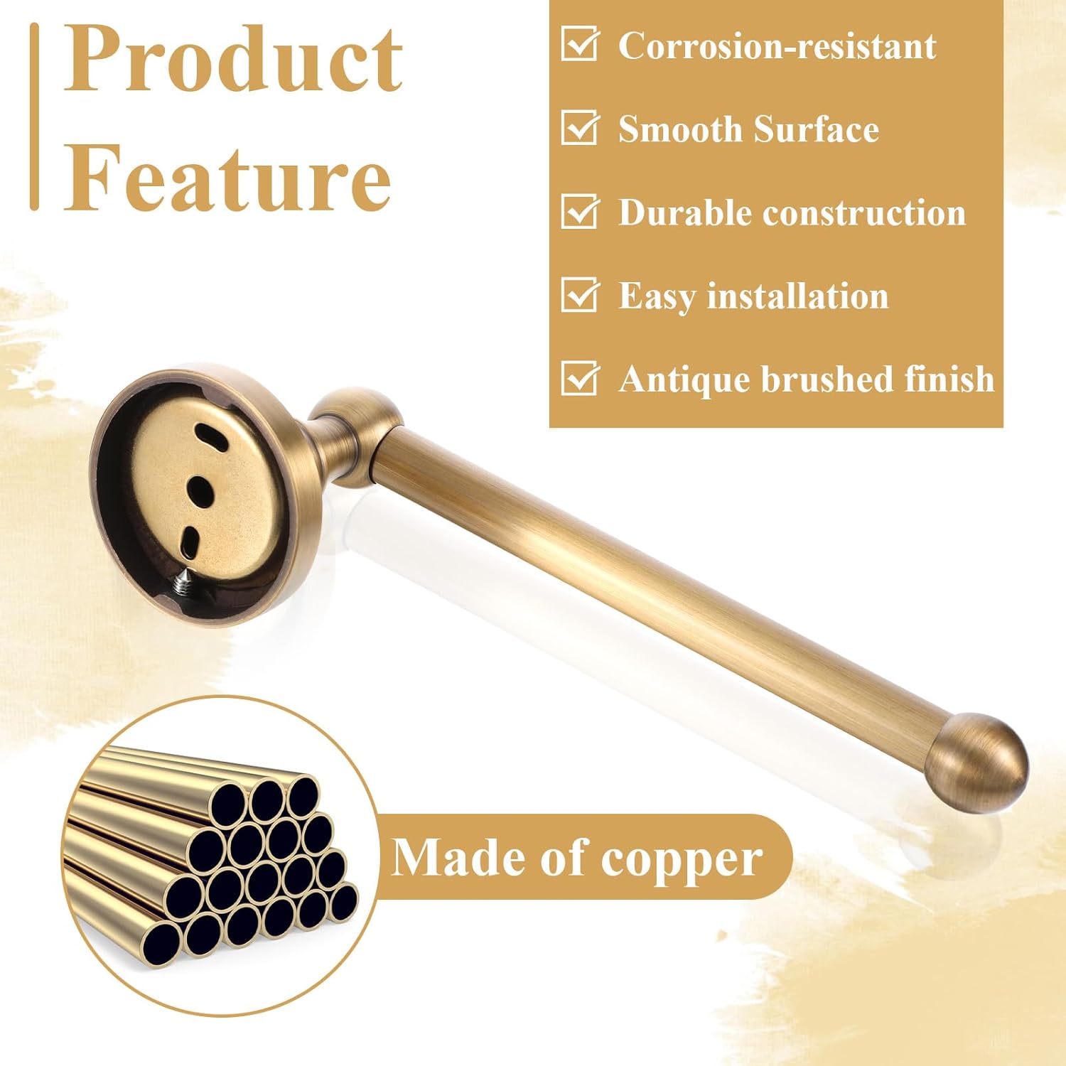 Product Name: Antique Hand Towel Holder and Toilet Paper Holder SetMaterial: CopperColor: BrassWeight: 472gPackaging: Foam bag + boxPackaging Contents:1 pc towel rack1 pc paper towel holder2 pcs wrenches4 pcs screws4 pcs plastic expansion tubes