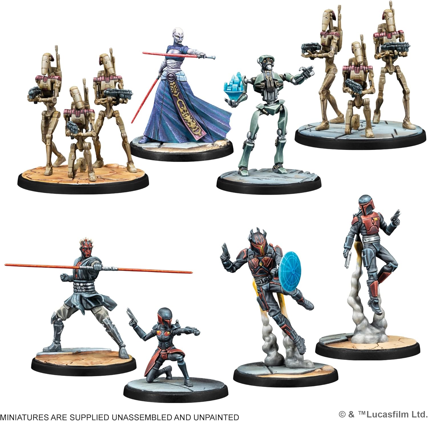 Iconic characters from across the Star Wars galaxy clash in this new miniatures skirmish game! Star Wars: Shatterpoint invites players to collect, assemble, and paint their own squads of heroes, villains, and their allies and pit them against one another in tense duels to control key battlefield objectives. Focusing on dynamic fights between key characters and a unique combat system that brings the feel of epic Star Wars duels to the tabletop, Star Wars: Shatterpoint gives players 16 characters to begin building their squads along with a selection of terrain to begin constructing their battlefields. Rounding out the set are all the cards, dice, movement tools and accessory players need to leap into the tactical combat of Star Wars: Shatterpoint!