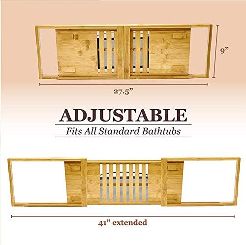 BATHTUB TRAY: This bamboo bathtub tray is newly designed, durable, and very adjustable. You can enjoy some juice or read an interesting book with this bathtub organizer, which can give you the most relaxing bathtub experience and enjoy a luxurious home spa treatment. This bathtub caddy tray is the ideal table for your bath.This sturdy caddy is designed to rest securely across your tub so you can relax and unwind. Our bathtub caddy is the ideal gift for any occasion, such as weddings, bridal shower, Mother’s Day, birthdays, housewarming, and more! SPECIFICATIONS: - Product name: Bamboo bathtub rack - Application: home/hotel/bathroom - Product color: Natural- Material: bamboo - Dimensions:27.5 x 9 in- Fully Extended: 41 x 9 in- Package Include: 1x bath rack NOTE: Dry completely after each use with a clean towel. CUSTOMER SERVICE: We aim to make products with heart, now press "add to cart" to start enjoying comfort and add some artistic flavor to your lifestyle! If you have any questions, please contact us directly through Amazon News to make us better, so that we can do better!