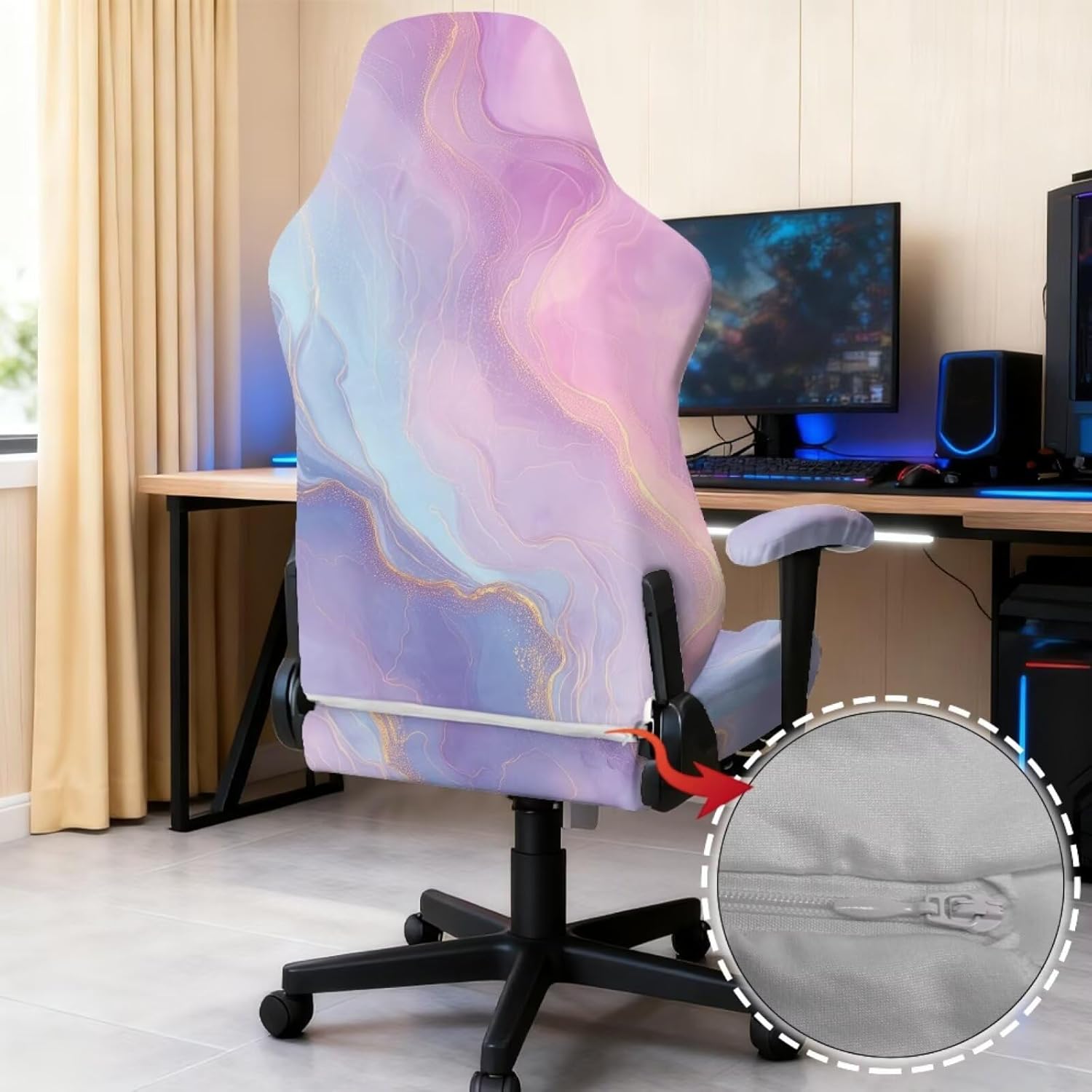Elastic and Comfortable Material: Made from a blend of polyester and spandex, this gaming chair cover is designed to provide long-lasting protection while ensuring maximum comfort Sizes: Designed to fit a variety of chair sizes, with a back height of 31-35", back width of 22-25", seat width of 16-22", and seat length of 22-25", making it a versatile option for most gaming chairs Armrest Covers Included: This gaming chair slipcover set comes with matching armrest covers to protect both the chair’s seat and back, ensuring a unified look and full protection for your gaming or office chair Easy to Install: Featuring a zipper for the back and adjustable buckle straps for the seat, this cover is designed for quick and hassle-free installation. It fits effortlessly onto your chair, making setup a breeze Dust Protection: This office chair cover prevents dust, stains, spills, and pet hair from damaging your chair, helping to keep it clean and extend its lifespan, ideal for gamers and office workers alike Versatile Design: Whether for office or home gaming, this chair cover complements a wide variety of gaming chair styles, adding a sleek, modern look Machine Washable: For your convenience, this computer chair cover is machine washable, making it easy to clean and maintain