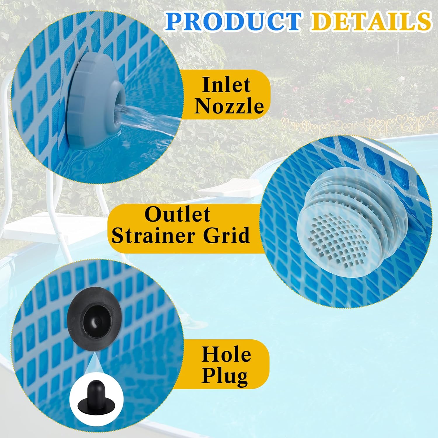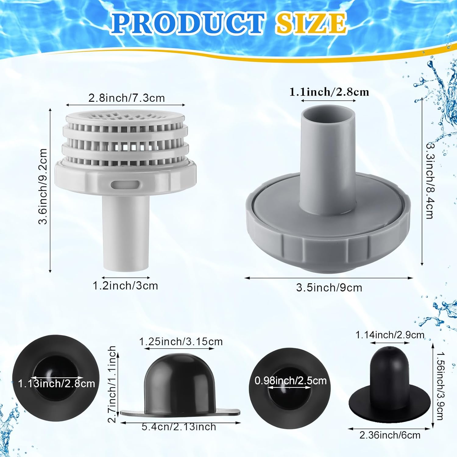 Features: Our swimming pool water jet connector kits make for a nice gift to pool owners. It demonstrates thoughtful consideration of their needs while promoting a cleaner and safer swimming environment, making their pool sessions more enjoyable. This swimming pool water jet connector kit is designed to be a nice fit for above ground pools with a maximum depth of 16 feet. Be it a family pool, a hotel pool, or indoor and outdoor swimming pools, the kit ensures clean and safe water, contributing to an enjoyable swimming environment. Specifications: Material: main ABS, rubber Adapting hose: 1.25 inches Color: gray, black Package includes: 6 Pieces of 11070 strainer connectors 4 Pieces of 11072 filter grids 2 Pieces 12364 pool inlet nozzles 6 x Strainer hole plugs Notes: Manual measurement, please allow slight errors on size. The color may exist a slight difference due to different screen displays
